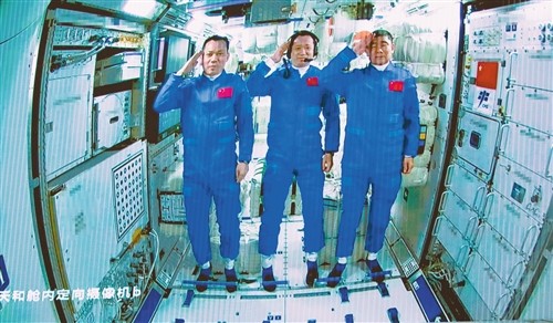 6月17日在北京航天飛行控制中心拍攝的進(jìn)駐天和核心艙的航天員向全國人民敬禮致意的畫面。在神舟十二號載人飛船與天和核心艙成功實現(xiàn)自主快速交會對接后,航天員乘組從返回艙進(jìn)入軌道艙。北京時間2021年6月17日18時48分,航天員聶海勝、劉伯明、湯洪波先后進(jìn)入天和核心艙,標(biāo)志著中國人首次進(jìn)入自己的空間站。新華社記者 金立旺攝