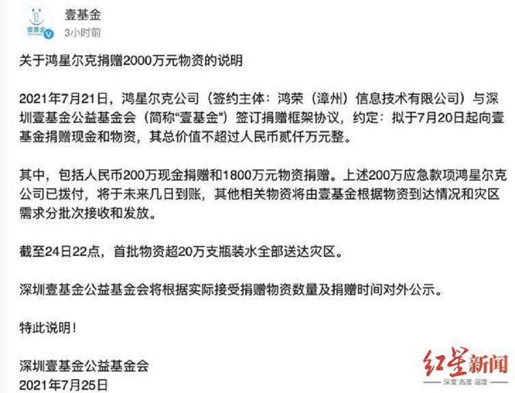 除了鄭州慈善總會,25日上午11時(shí),壹基金也發(fā)布了“關(guān)于鴻星爾克捐贈2000萬元物資的說明”。
