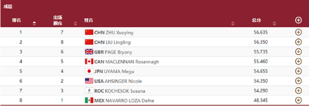 中國選手朱雪瑩倒數(shù)第二個登場,起跳后,她節(jié)奏控制得很好,騰空高度也不錯,位移控制到位,整套動作完成相當(dāng)出色,發(fā)揮出了平常的訓(xùn)練水平,最終以56.635分超越佩奇排名第一,這也意味著中國隊已經(jīng)拿到了這枚金牌。